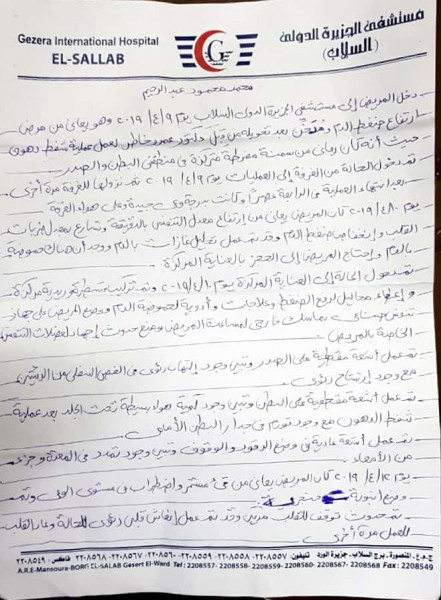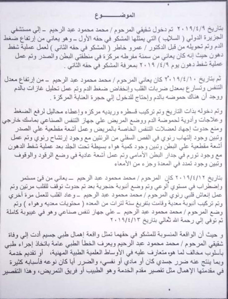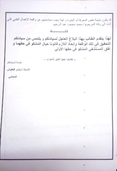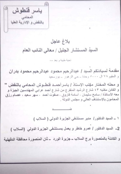 وطالب”قنطوش” في البلاغ العاج بالتحقيق في الواقعة وإتخاذ الإجراءات القانونية اللازمة حيال المشكو في حقهما وإصدار قرار بإغلاق مستشفي الجزيرة الدولي لإنقاذ حياة المواطنين من إهمال.
