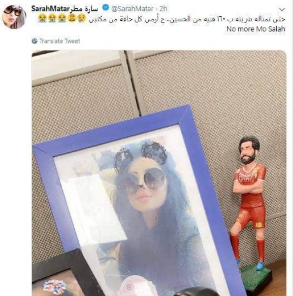 وتبعتها بتغريدة ثالثة لصورة لتمثال لـ"صلاح" على مكتبها قائلة: "حتى تمثاله شريته ب 160 قنيه من الحسين.. ح أرمي كل حاقة من مكتبي No more Mo Salah".