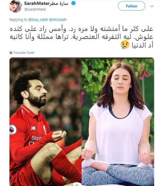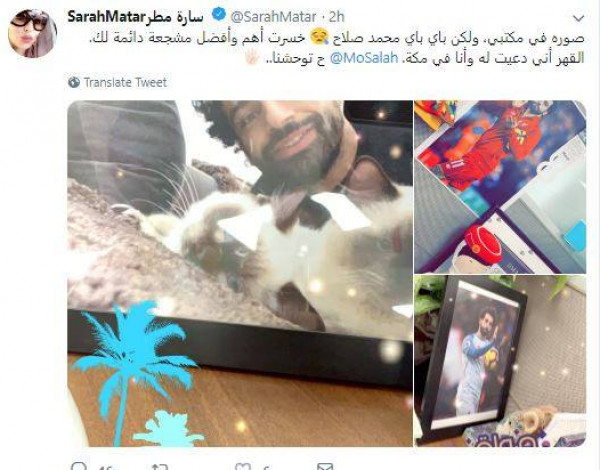 ونشرت "مطر" على صفحتها صورة لحساب "صلاح" على "تويتر" معلقة عليها قائلة: "بكل أسف .. قررت إلغاء متابعتي لمحمد صلاح.. ح توحشني"، كما غردت بصورة أخرى لمكتبها ويظهر عليه صور للاعب المصري معلقة: "صوره في مكتبي، ولكن باي باي محمد صلاح، خسرت أهم وأفضل مشجعة دائمة لك. القهر أني دعيت له وأنا في مكة. ح توحشنا".