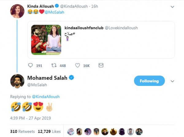 وكانت الفنانة كندة علوش قد نشرت صورة لها وهي تقوم بتمرينات اليوجا بالشكل نفسه الذي احتفل به "صلاح" بأحد أهدافه في المباراة الأخيرة لليفربول أمام هدرسفيلد، وهو ما علق عليه "صلاح" بوجوه تعبيرية ضاحكة ومعجبة.