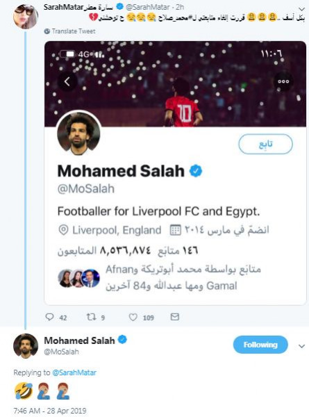 ومن جانبه علق "صلاح" على التغريدة الأولى للكاتبة السعودية، إذ وضع فقط رسوم تعبيرية لرجل مصدوم قبل أن يتبعها بوجه يدمع من الضحك.