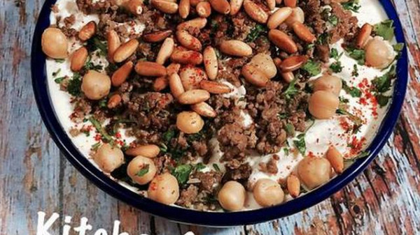 12- في طبق التقديم، ضعي أولاً بضع حبات حمص مسلوق ومن ثمّ ضعي الفتة بعدها اللحم المفروم.