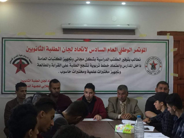 عقد اتحاد لجان الطلبة الثانويين، الإطار الثانوي للجبهة الديمقراطية لتحرير فلسطين، مؤتمره السادس لإقليم قطاع غزة تحت شعار الصمود في وجه العدوان علي قطاع غزة», بحضور الرفيق طلال ابو ظريفة عضو المكتب السياسي للجبهة، والرفيق أحمد أبو حليمة مسؤول كتلة الوحدة الطلابية بقطاع غزة، والرفيق سامي ضهير مسؤول اتحاد لجان الطلبة الثانويين بالقطاع وعدد من قيادة وكوادر اتحاد لجان الطلبة الثانويين بالقطاع.