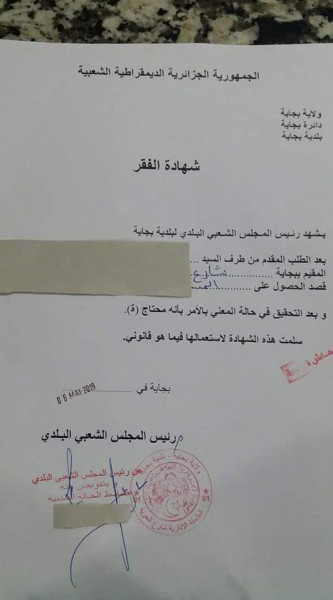 الشھادة التي طلبت الإدارات لدى بعض البلديات، من الجزائريین ملفاً لاستخراجھا يتعلق ببطاقة الإقامة، شھادة طبیة، نسخة من جدول الضرائب، تصريح عدم العمل، شھادة عدم التسجیل في الضمان الاجتماعي، اعتبرھا الجزائريون إھانة لھم في الوقت الذي انتفضوا فیه من أجل العدالة في توزيع الثروة ومحاربة نھب المال العام.