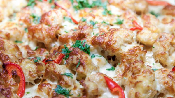 5- في صينية فرن، ضعي الخليط ثم ضيفي الفلفل الأسود وجبنة الموزاريلا.