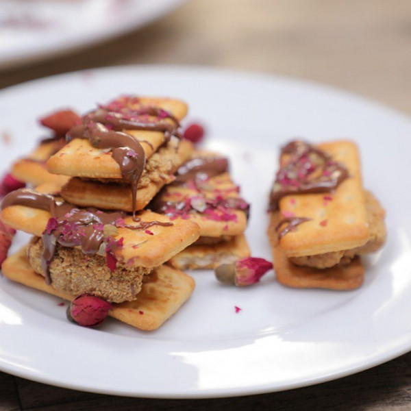 3. احشي كرات الحليب بين حبتين من البسكويت المالح.