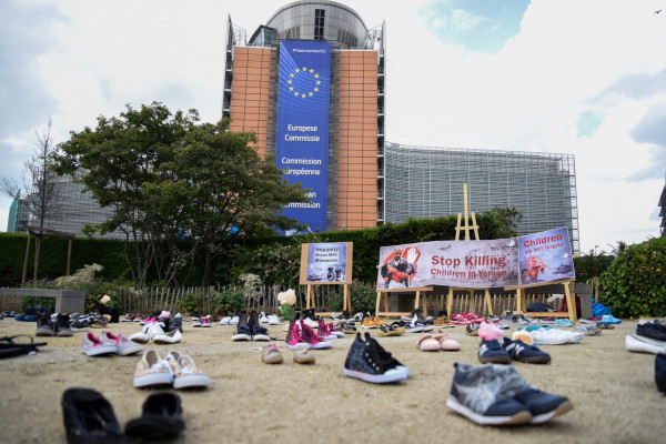مئات الأحذية بساحة مقر المفوضية الأوروبية احتجاجًا على الحرب في اليمن