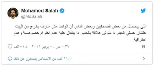 لكن تجمهر العشرات من أبناء البلدة أمام منزل عائلة صلاح لالتقاط الصور معه، حرمه من تأدية الصلاة، فكتب في حسابه الرسمي على موقع "تويتر": "اللي بيحصل من بعض الصحفيين وبعض الناس أن الواحد مش عارف يخرج من البيت علشان يصلي العيد. دا ملوش علاقة بالحب. دا بيتقال عليه عدم احترام خصوصية وعدم احترافية".
