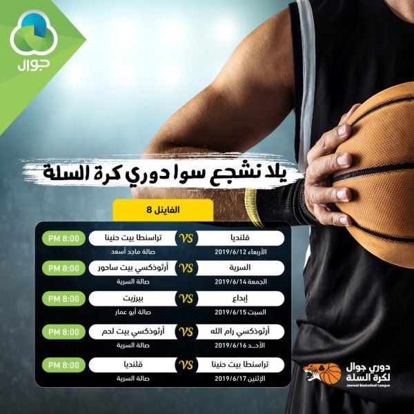 اعلن الاتحاد الفلسطيني لكرة السلة عن برنامج الفاينل 8 ضمن دوري جوال السلوي ، بحيث يلتقي مركز قلنديا فريق تراسنطا بيت حنينا بدربي القدس الاربعاء الموافق12-6-2019 على صالة ماجد اسعد بالبيرة الساعة 8 مساء، فيما يستضيف فريق السرية فريق ارثوذكسي بيت ساحور يوم الجمعة الموافق 14-6-2019 على صالة السرية في مباراة الاياب الساعة 8 مساء.