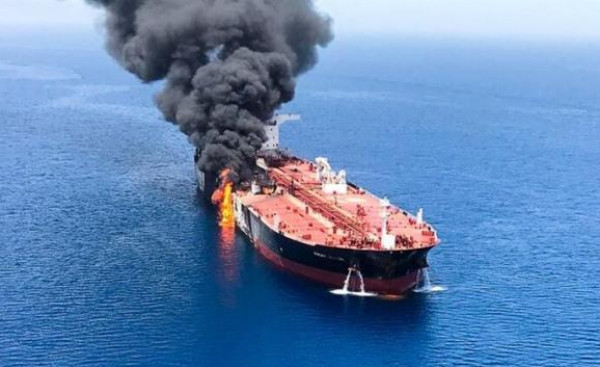 وكانت ناقلتا نفط في خليج عمان قرب سواحل إيران، تعرضتا إلى هجوم، أدى إلى اشتعال النيران في إحداهما، وإصابة طفيفة لأحد أفراد طاقم السفينة.