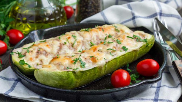 7- وزّعي مزيج اللحم بالتساوي داخل قوارب الكوسى. أضيفي جبن الموزاريلا المبشور وأدخلي الصينية إلى الفرن لـ15-20 دقيقة.