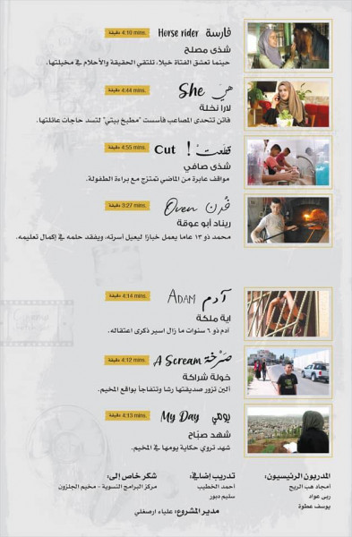عرضت مؤسسة شاشات سينما المرأة بالتعاون مع مركز البرامج النسوية في مخيم الجلزون، 7 أفلام من إخراج فتيات ونساء من المخيم، وذلك عصر اليوم الأحد في قاعة المركز، والتي جاءت بعد مشروع تدريبي إنتاجي مدعوم من الصندوق العربي للثقافة والفنون "آفاق".
