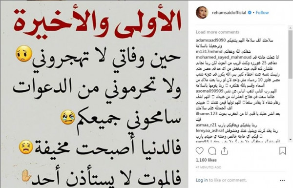 وكتبت ريهام سعيد، عبر حسابها بموقع الصور الشهير "إنستجرام" "حين وفاتي لا تهجروني ولا تحرموني من الدعوات، سامحوني جميعكم.. فالدنيا أصبحت مخيفة، والموت لا يستأذن أحدا".