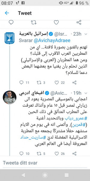 فاجأ المتحدث باسم "الجيش الإسرائيلي" أفيخاي أدرعي كل محبي الفنان المصري عمرو دياب عندما اشار الى انه يتمنى في يوم من الأيام ان يشهد حفلاً مشتركاً يجمع دياب مع الفنانة "الإسرائيلية" المفضلة لأدرعي ساريت حداد.