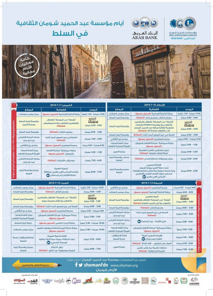 تنظم مؤسسة عبد الحميد شومان، في العاشر من تموز (يوليو) القادم أيام مؤسسة عبد الحميد شومان الثقافية في السلط، لأربعة أيام متتالية، وبالتعاون مع محافظة البلقاء وبلدية السلط الكبرى ووزارة الثقافة/ مديرية ثقافة البلقاء، ووزارة السياحة والآثار العامة/مديرية سياحة البلقاء، وشركة النقليات السياحية (جت).