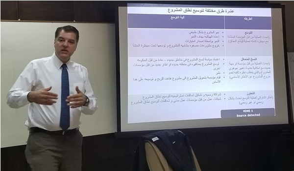كما ركز السيد جابي في حديثه على كيفية تخطيط الفرد لاتخاذ مشروع وتطويره ليصبح مؤسسة كاملة تحقق الاستدامة ولا تعتمد على المانحين للأبد. واستعرض الآليات الكفيلة بتحقيق هذا الأمر.
