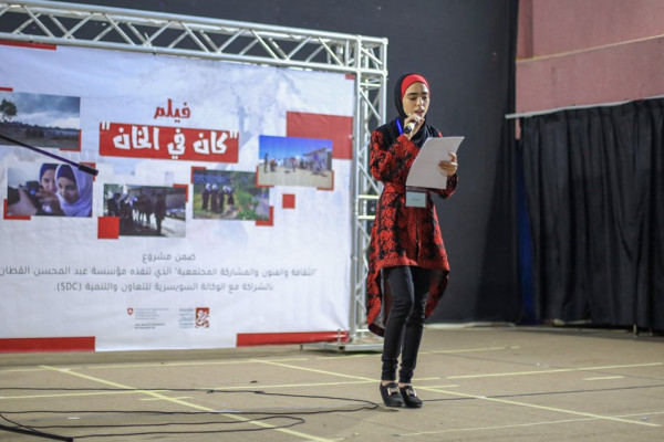 ضمن مشروع " الثقافة والفنون والمشاركة المجتمعية " الذي تنفذه مؤسسة عبد المحسن القطان ، بالشراكة مع الوكالة السويسرية للتنمية والتعاون (SDC) بالتعاون مع بلدية خان يونس ، ومديرية التربية والتعليم – خان يونس نظم برنامج البحث والتطوير التربوي بمؤسسة عبد المحسن القطان عرض افتتاحي لفيلم " كان في الخان "أنتج ضمن فعاليات مشروع المشاركة المجتمعية، بحضور عدد من المواطنين والوجهاء وأولياء أمور الطلبة المشاركين في المشروع بقاعة الهلال الأحمر الفلسطيني بخان يونس.