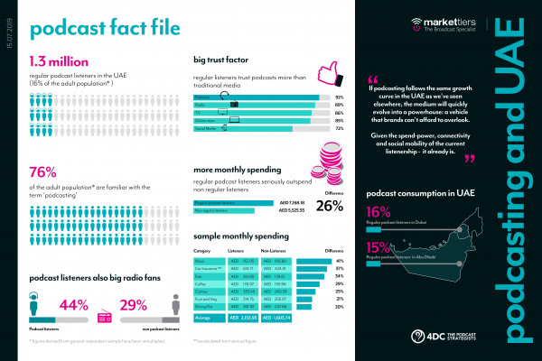 وتمت إتاحة البيانات للاطلاع قبل صدور النسخة الكاملة من تقرير ’ماركيتيرز‘ حول خدمة ’بودكاست‘ في دولة الإمارات، وهو أول تقرير متخصص بمجال سلوكيات الاستماع إلى هذا النوع من الوسائط في الدولة. ويمكن التسجيل بشكل مسبق للحصول على نسخة من التقرير المقرر إصداره في شهر أغسطس المقبل عبر الرابط التالي: https://markettiers.com/podcasts/