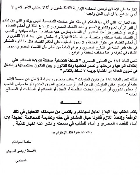 وذكر المستشار ياسر قنطوش في بلاغه، أن مواد الدستور المصري تنص على " السلطة القضائية مستقلة تتولاها المحاكم على إختلاف أنواعها و درجاتها و تصدر أحكامها وفقا للقانون و يبين القانون صلاحياتها و التدخل في شؤون العدالة أو القضايا جريمة لا تسقط بالتقادم "، وأن المشكو في حقه قام بانتهاك ومخالفة مواد القانون وتعاقب عليها المادة ١٨٤ من قانون العقوبات " يعاقب بالحبس وبغرامة لا تقل عن خمسة آلاف جنية أو بإحدى هاتين العقوبتين كل من أهان أو سب بإحدى الطرق المتقدم ذكرها مجلس الشعب او مجلس الشوري او غيره من الهيئات النظامية او الجيش أو المحاكم او السلطات أو المصالح العامة".