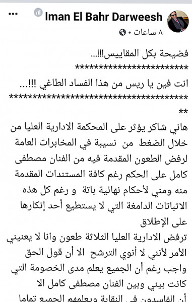 حيث جاء في البلاغ المقدم إلى النائب العام بقيام إيمان البحر محمد سيد درويش البحر بتدوين منشور من خلال حسابه الشخصي على مواقع التواصل الإجتماعي "فيسبوك" بتاريخ 29 من شهر يوليو الجاري، ادعى فيه أن هناك جهة سيادية تدخل في قرارات وأحكام القضاء المصري وحدد المحكمة الإدارية العليا التي ذكرها في منشوره بأنها ترفض الطعون المقدمة ضد الفنان هاني شاكر أمير الغناء العربي ونقابة المهن الموسيقية، بناءا على ممارسة ضغوط عليها لرفضها، وذكر عبارات من شأنها إثارة الفتن والرأي العام ضد القضاء المصري، وتشير إلى زعزعة الثقة في أحكام القضاء، وتوهم للمواطن بأن القضاء يمارس عليه ضغوط من جهات سيادية، وتغافل بأن القضاء المصري سلطة قضائية مستقلة و منفصلة عن السلطة التنفيذية ولا سلطان على رجال القضاة إلا للقانون وأن أحكام القضاء هي عنوان الحقيقة ولا يجوز التعقيب عليها، وخاصة وأن المشكو في حقه يعتبر شخصية فنية ومنشوارته تلك قد تدعو إلى إثارة الفتن بالشارع المصري، ومحاولة منه فى ترويج إشاعات بأنه يجوز التدخل في شؤون القضاء المصري وأحكامه، مما قد يستغلها البعض من الأعداء المتربصين بالوطن واستقراره في ظل الدولة المصرية الحديثة.