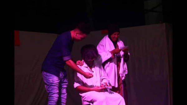 هذا ما قاله أبو الأديب وهي شخصية الحكيم الناصح، الرجل الطيب الخلوق الدمث ، تلك الشخصية التي جسدها على خشبة المسرح الأديب الفنان محمد العطلة، الذي اشعل تفاعل الجمهور أكثر حين قال:" أنا مش زعلان منك يا صاحبي، أنا زعلان من حالي لأني مقدرتش أحافظ عليك" ووجه رسالته للجمهور: " انتو اللى كبرتوه ونفختوه، انتو بس اللي قادرين تنزلوه، وحتنزل يا فرج