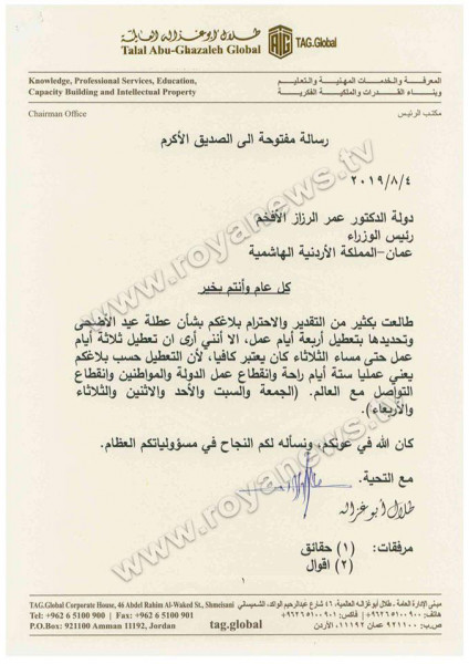 عبر رجل الأعمال الأردني، طلال أبو غزالة، عن رفضه لإقرار رئاسة الوزراء الأردنية، إجازة عيد الأضحى المبارك لأكثر من ثلاثة أيام.