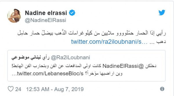 وعلّقت مواطنته الممثلة نادين الراسي على فيديو الفنان وديع الشيخ قائلة: "رأيي إذا الحمار حمَّلوووو ملايين من كيلوغرامات الذَّهب بيضلّ حمار حامِل دهب …".