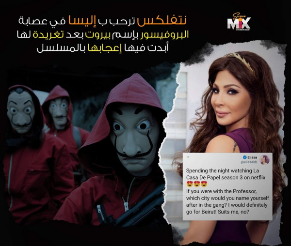وكتبت إليسا، عبر "تويتر" تغريدة لها فقالت: "أنا جاهزة لأكون أحد أفراد عصابة البروفسور والفريق شكرًا نتفليكس"، ثم توجهت إلى إحدى بطلات المسلسل وتدعى "نيروبي"، فقالت لها: "آتون لإنقاذك كل الحب، بيروت".