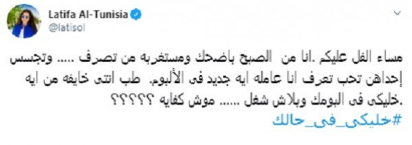 لطيفة كتبت، على حسابها الخاص على موقع "تويتر": "مساء الفل عليكم .. انا من الصبح باضحك ومستغربه من تصرف ..... وتجسس إحداهن تحب تعرف انا عامله ايه جديد فى الألبوم".