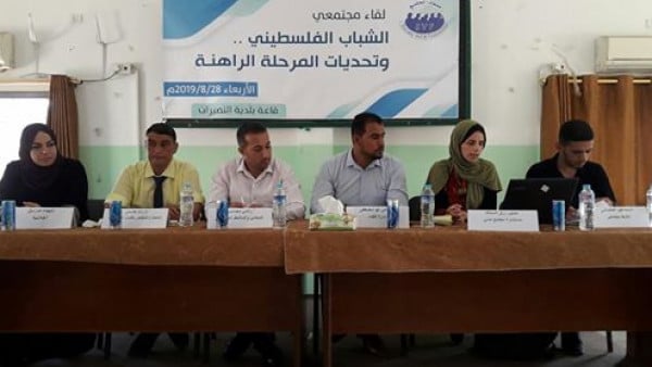 عقدت مؤسسة صوت المجتمع لقاء مجتمعي بعنوان الشباب الفلسطيني وتحديات المرحلة الراهنة في قاعة المؤتمرات التابعة لبلدية النصيرات , حيث حضر اللقاء المجتمعي لفيف من الشباب والنشطاء وكوادر العمل الاهلي وعدد من الاعلاميين.