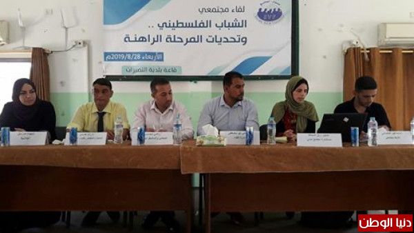 عقدت مؤسسة صوت المجتمع لقاء مجتمعي بعنوان الشباب الفلسطيني وتحديات المرحلة الراهنة في قاعة المؤتمرات التابعة لبلدية النصيرات , حيث حضر اللقاء المجتمعي لفيف من الشباب والنشطاء وكوادر العمل الاهلي وعدد من الاعلاميين.