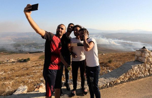 تداول نشطاء عبر مواقع التواصل الاجتماعي صورا لمواطنين لبنانيون يقومون بالتقاط صور "السليفي" قرب الحدود اللبنانية بعد استهداف معسكر "أفيفيم" من قبل حزب الله عصر اليوم الأحد.