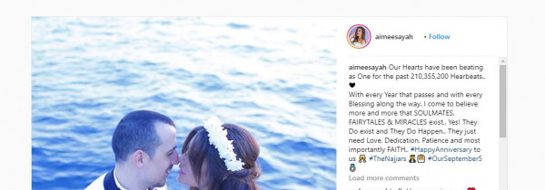 وقد نشرت ايميه صياح صورة رومانسية جمعتها بزوجها عبر حسابها على انستغرام وعلقت قائلة: “قلبينا يدقون كقلب واحد منذ 210,355,200 دقة” بحسب "نورت".