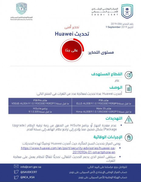 أطلق المركز الوطني الإرشادي للأمن السيبراني التابع للهيئة الوطنية للأمن السيبراني تحذيراً أمنياً ذا مستوى عالٍ جداً لحائزي بعض الأجهزة من نوع هواوي.