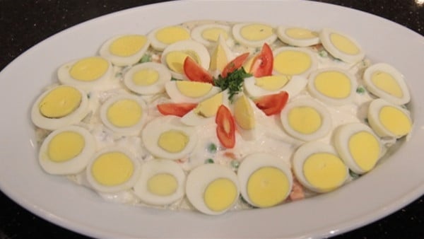 * يضاف البيض المسلوق والمايونيز والمستردة، وتقدم مع بيض مسلوق على الوجه