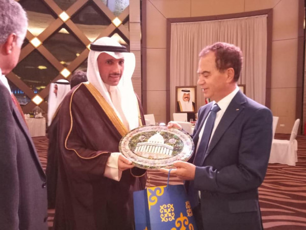 كرم سفير دولة فلسطين لدى جمهورية كازاخستان منتصر أبو زيد السيد/مرزوق علي الغانم رئيس مجلس الأمة لدولة الكويت الشقيقة ويقلده مجسم قبة الصخرة المشرفة ومجسم خارطة فلسطين التاريخية، لمواقفه المبدئية الشجاعة المشرفة والمميزة الداعمة للقضية الفلسطينية في كافة المنابر الدولية