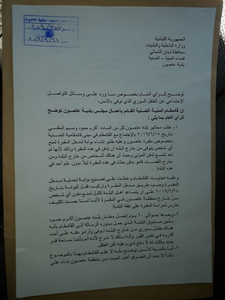 لكن المُفارقة أن رئيس بلدية عاصون، معتصم حسن عبد القادر نفى ما هو متداول عبر مواقع التواصل الاجتماعي، موضحاً أن "الطفل توفي نهار الجمعة الفائت نتيجة دهسه بسيارة في بلدة بقرصونة شمال لبنان، وحاول أحد أقربائه دفنه في بلدة عاصون المجاورة، إلا أن المسؤول عن مدافن البلدة رفض ذلك، لأنه ليس من النازحين السوريين في عاصون، إذ إن هناك قراراً صادراً من القائم قامية منذ سنتين بعدم دفن سوريين في عاصون إلا من يسكنون فيها من لبنانيين وسوريين".
