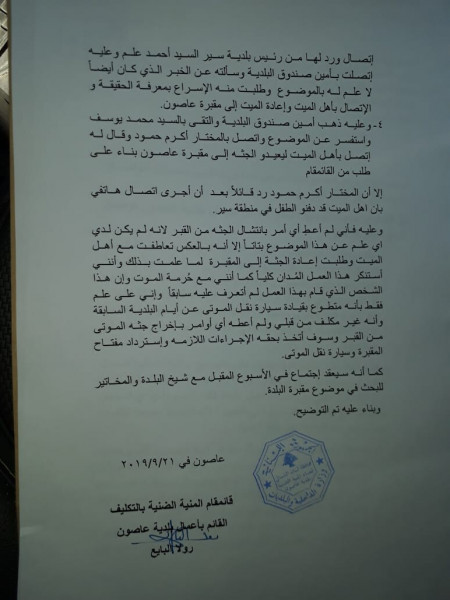 وقال عبد القادر في حديث لموقع العربية: "قرار رد الجثمان اتخذناه رغماً عنا، لأن الأرض المخصصة للمدافن لم تعد تتسع. لو مر على دفنه أكثر من أسبوع ما كنا سمحنا أخلاقياً وإنسانياً بنقل جثمانه، لكن المسؤول عن مدافن عاصون رفض دفنه في البلدة بعد ساعات من وفاته، ليعود رئيس بلدية سير الضنية في شمال لبنان ليُقرر دفن الطفل السوري في مدافن البلدة".