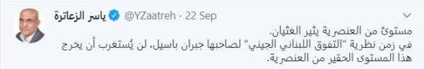 واستنكر الكاتب الفلسطيني ياسر زعاترة الحادثة، فغرد عبر حسابه الرسمي على "تويتر": مستوىً من العنصرية يثير الغثيان. في زمن نظرية "التفوق اللبناني الجيني" لصاحبها جبران باسيل، لن يُستغرب أن يخرج هذا المستوى الحقير من العنصرية".