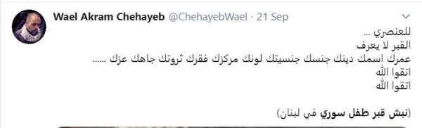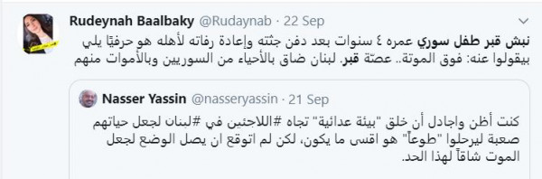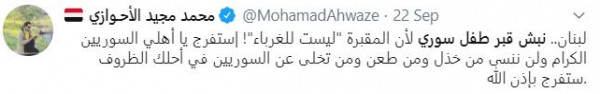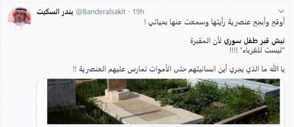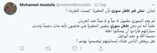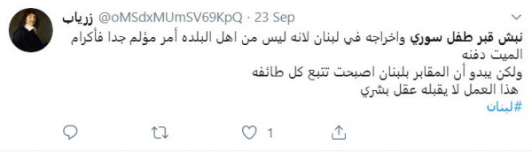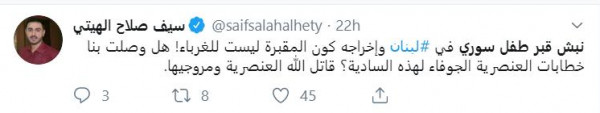 وغرد الإعلامي العراقي سيف صلاح الهيتي مُستنكراً: "نبش قبر طفل سوري في #لبنان وإخراجه كون المقبرة ليست للغرباء! هل وصلت بنا خطابات العنصرية الجوفاء لهذه السادية؟ قاتل الله العنصرية ومروجيها.".