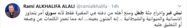 وكتب رامي الخليفة: "نبش قبر واخراج جثة طفل ومنع أهله من دفنه في المقبرة فقط لأنه سوري أمر يتجاوز الانسانية والحيوانية والشيطانية ... إنه الجنون بعينه.... انه مما تعجز الكلمات عن وصفه أو التعليق عليه".