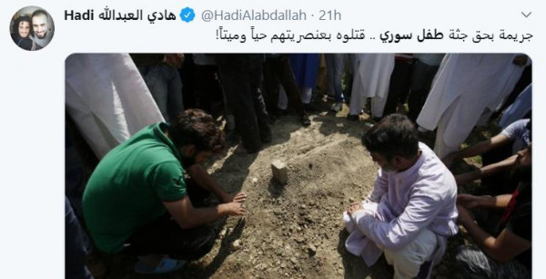 وبعبارة مؤثرة قصيرة، علق الناشط السوري هادي العبدلله على الحادثة قائلاً: "جريمة بحق جثة طفل سوري .. قتلوه بعنصريتهم حياً وميتاً!".