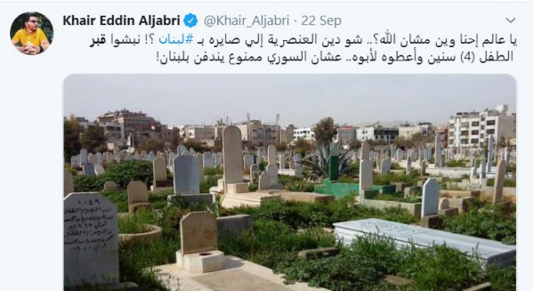 وتساءل الإعلامي العراقي خير الدين الجابري متؤلماً: "يا عالم إحنا وين مشان الله؟.. شو دين العنصرية إلي صايره بـ #لبنان ؟! نبشوا قبر الطفل (4) سنين وأعطوه لأبوه.. عشان السوري ممنوع يندفن بلبنان!".