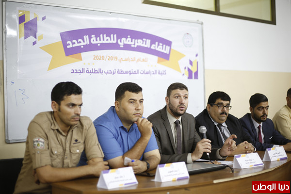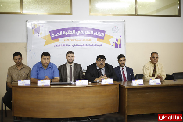 نظمت كلية الدراسات المتوسطة في جامعة فلسطين لقاء ترحيبيًا بالطلبة الجدد، وذلك بحضور عميد الكلية الدكتور أمجد الشنطي، ود.نهاد بدرية عميد شؤون الطلبة، ورؤساء الأقسام جميعًا.