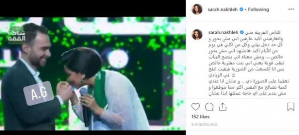 ونشرت "سارة" عبر حسابها الشخصي على "الإنستجرام" مقطع من حفلة شيرين، عبر حسابها على "الإنستجرام"، مُعلقة: " للناس القريبة مني والعارفيني أكيد عارفين إني مش بحور، ومش معنى إني بنصح البنات تبقى قوية يعني إني بنت مفترية خالص بس أنا اتلسعت من الشوربة فبقيت انفخ في الزبادي".