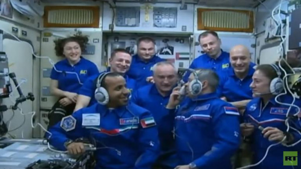 ويظهر في الفيديوهات استقبال الرواد الموجودين على متن المحطة لرائد الفضاء الروسي، أوليغ سكريبوتشكا، ورائدة الفضاء الأمريكية، جيسيكا مائير، وأول رائد فضاء إماراتي، هزاع المنصوري.