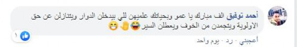 بينما تمنى الشاب أحمد توفيق لها التوفيق ودعاها لتعليم الفتيات الأخريات السواقة قائلاً:" الف مبارك وبحياتك علميهن للي بيدخلن الدوار ويتنازلن عن حق الاولوية ويتجمدن من الخوف ويعطلن السير".