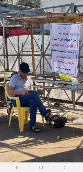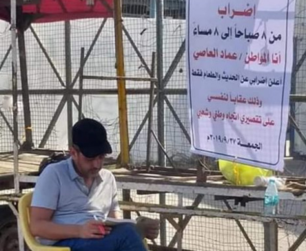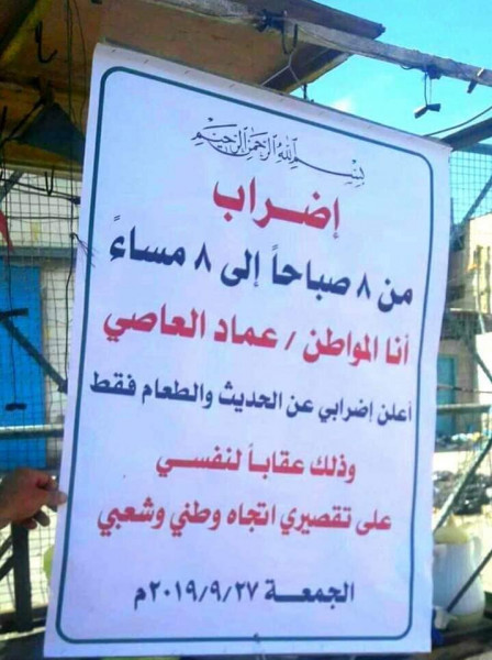 وكتب المواطن عماد العاصي، لافتة وعلقها بجانبه في أحد الشوارع، وقال فيها: "إضراب من 8 صباحًا إلى 8 مساءً، أنا المواطن عماد العاصي، أعلن إضرابي عن الحديث الطعام فقط، وذلك عقابًا لنفسي على تقصيري اتجاه وطني وشعبي".