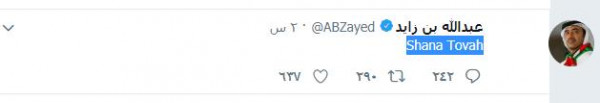 وكتب بن زايد على حسابه الرسميّ بموقع (تويتر) التهنئة باللغة العبريّة، لكن بأحرف إنجليزية: "Shana Tova" بمعنى سنة مليئة بالخير والبركة.