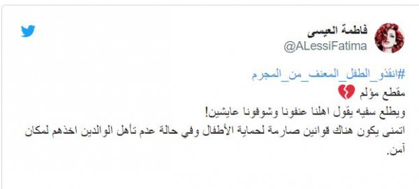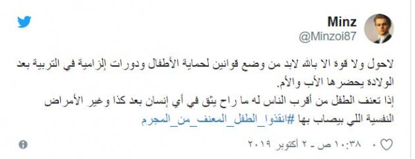 وعلق مغرد يحمل اسم "منز": "لاحول ولا قوة الا بالله لابد من وضع قوانين لحماية الأطفال ودورات إلزامية في التربية بعد الولادة يحضرها الأب والأم. إذا تعنف الطفل من أقرب الناس له ما راح يثق في أي إنسان بعد كذا وغير الأمراض النفسية اللي بيصاب بها".
